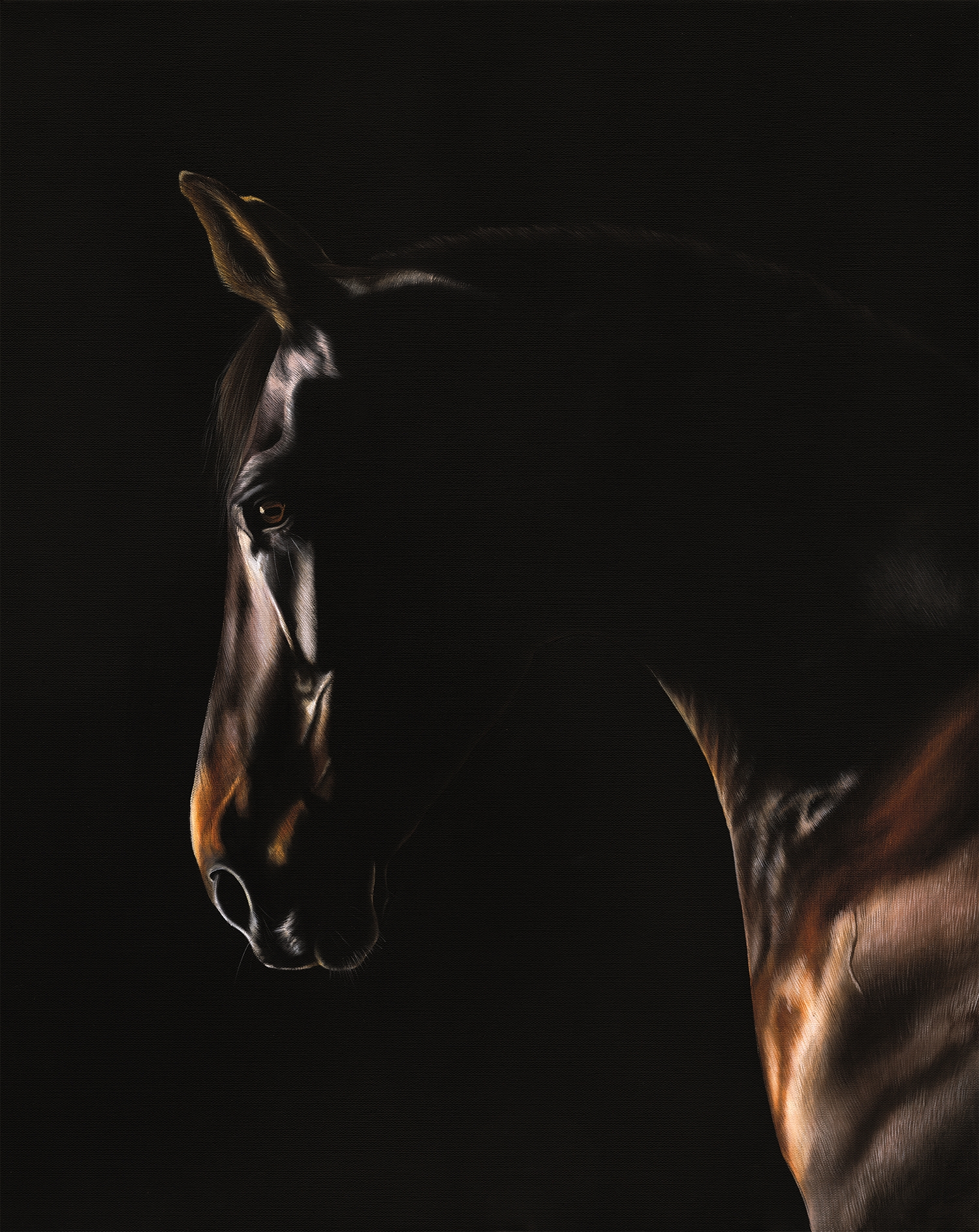 This painting presents the horse in a quiet, introspective pose. The deep black background immediately pulls the viewer in, and as a result, the warm highlights along the face and shoulder become the central focus. As the light moves gently across the contours, it reveals refined detail—the softness around the eye, the smooth lines of the muzzle, and the subtle strength in the neck.